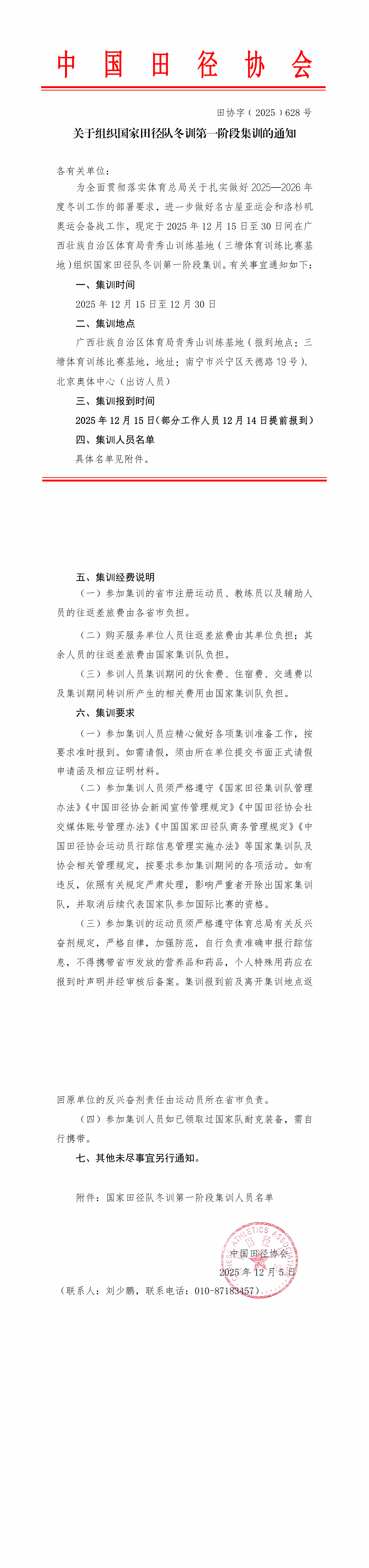 12月5日,中国田径协会正式公布2025—2026年度国家田径队冬训第一阶段集训人员名单,学校体育部教师田丰、孔玲瑶凭借过硬的执教能力、扎实的专业素养成功入选,助力国家田径队全力备战名古屋亚运会和洛杉矶奥运会。